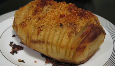 The Hasselback potatoes are something we saw prepared on the Food Network late last year and thought they looked good.  They turned out great, but took a looooooong time to cook, and were somewhat “needy.”  It takes some fancy knife skills to make all of the required slices in the potato without slicing all the way through.  I clearly lack these skills.  Additionally, for the first 30 minutes, you’re supposed to be basting the potatoes every 5 minutes with a chicken stock and butter mixture.  Well, The Littlest Apple is “needy” too, particularly so while I was preparing this dinner, so the potatoes didn’t get all the basting called for in the recipe.  I maybe did it 2 or 3 times, but luckily, they were still plenty tasty.  Recipe below.