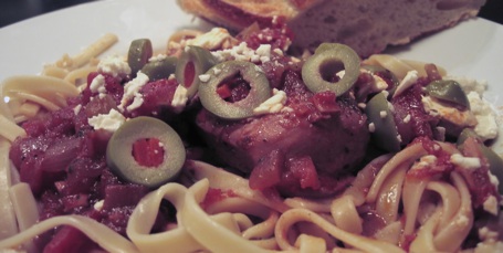 Whenever I come across a recipe in a magazine, I tear out the page, and place it in a “Recipes To Try” binder, organized by Chicken, Beef, Dessert, Breakfast, and Other.  The categories probably need a little more refining, but that worked at the time I made my binder about 4 years ago.  My Recipes to Try binder is getting way too full as I keep adding, adding, adding, and not making very many of the recipes, relying instead on the internet, Food Network, or old standbys.  This week when doing my menu planning, I made a conscious effort to select a few recipes from the binder.  This Mediterranean Chicken Fettuccine from Taste of Home sounded good, and the addition of olives and feta at the end was especially appealing to me.  It smelled wonderful while it was cooking, as dishes with garlic and wine typically do.  My husband, ever The Picky Apple, opted not to add the feta and olives to his, and he isn’t really big on dishes with wine.  But he ate it, liked it, and seemed willing enough to eat it again in the future (but probably wouldn’t request it).  I liked it enough to move this recipe to my Keepers file and share it with you.