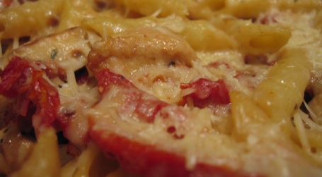 After making those Sun-dried Tomato Chicken Roll-ups, I had some leftover penne and sun-dried tomatoes.  In an attempt to cut back my ever-increasing grocery bill (all that baking adds up!), I “shopped” at home first, and found a recipe in Taste of Home that I could make with ingredients already on hand.  It was easy to put together and not too rich.  I would use homemade alfredo sauce (as opposed to the stuff in the jar) if I made this again.  The Picky Apple didn’t care for this dish because of the wine sauce.  You would think I’d have learned my lesson after serving him the Mediterranean Chicken Fettuccine with red wine sauce, but this dish used white whine, and much less of it.  Thought I could sneak it by him, but apparently not.    Those of you that love alfredo sauce and wine sauces will like this dish.