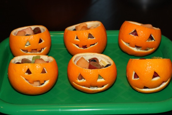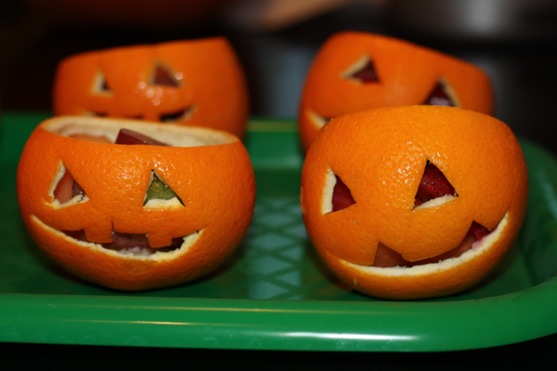 I brought these cute little fruit cups to The Littlest Apple’s Fall Party at school.  (The party he had to miss because he’s sick.)  I saw the idea in Family Fun magazine, and thought they were absolutely adorable!  You just cut off the top of an orange, hollow it out, carve a jack-o-lantern face, and fill with fruit!  I’d like the give a big THANK YOU to my mom who did ALL of the work on these while I was making some Pumpkin Spice Scented Playdough.  My mom did an amazing job, and The Littlest Apple’s teachers were very impressed (and so was I)!