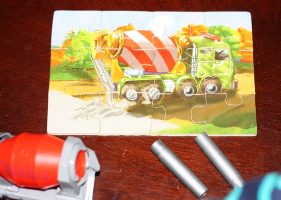We spent some time assembling these construction puzzles that The Littlest Apple got for Christmas. They are still too difficult for him to do on his own, but but I assemble the outside and he puts the pieces in the middle.