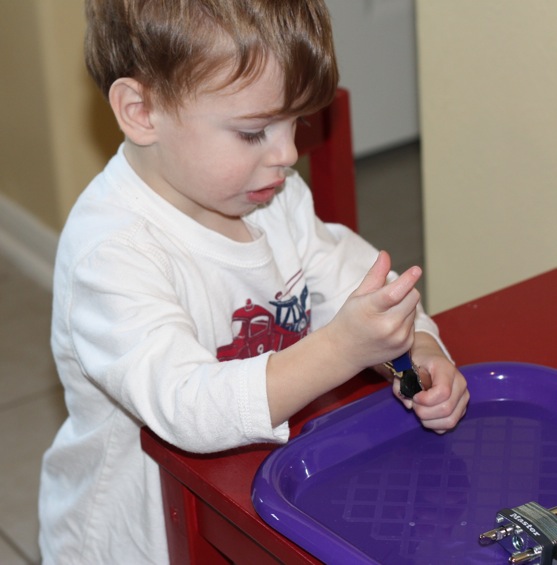 I presented 3 locks and keys to The Littlest Apple. The idea was that he would match the key to the proper lock. (Idea from Chasing Cheerios). The Littlest Apple tried it once, then proceeded to bring them to the living room and bang the biggest metal lock repeatedly on our side table…we still have the dings to prove it.