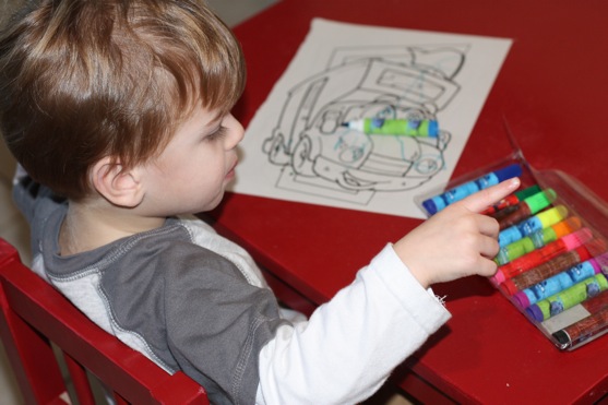 We colored with some new markers. We haven’t used markers in a while, so this kept his attention for about 10 minutes! The Littlest Apple also made me draw him a cement mixer to color, but then he wanted me to color it for him. Silly boy.