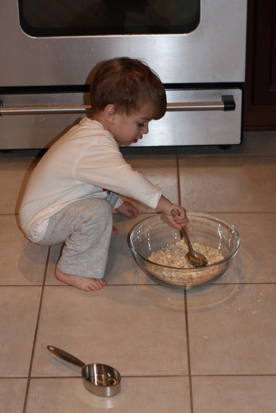 We’ve done this once before and it was a huge hit: Oatmeal Transferring. I put a bowl full of oatmeal at one end of the kitchen and an empty bowl at the other end, then handed The Littlest Apple a measuring cup and a spoon to transfer the oatmeal to the empty bowl. In theory, I do it too, and we “race,” but that didn’t really happen this time. After transferring the entire bowl of oatmeal back and forth twice, he moved the bowls closer together and just went to town playing with the oatmeal.