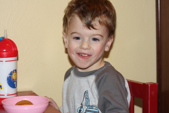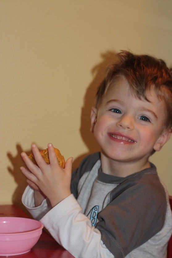 SUCCESS!!  It wasn’t completely miraculous, but he had more than a few licks of the batter, and took a few (3, to be exact…you can see he’s got some of it in his teeth) bites of his muffin before crumbling it to smithereens.  I failed to capture that particular mess on camera, so you’ll just have to imagine it.  I’m taking joys in the small victories, like 3 bites of a new food.