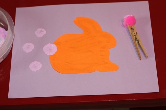 I attempted this little Bunny Tails craft, but The Littlest Apple wasn’t very interested. The idea was to use a clothespin to hold a pom pom, then dip the pom pom in paint to create a tail and other spots for the bunny on the picture. The Littlest Apple did a few dots and I did the rest!