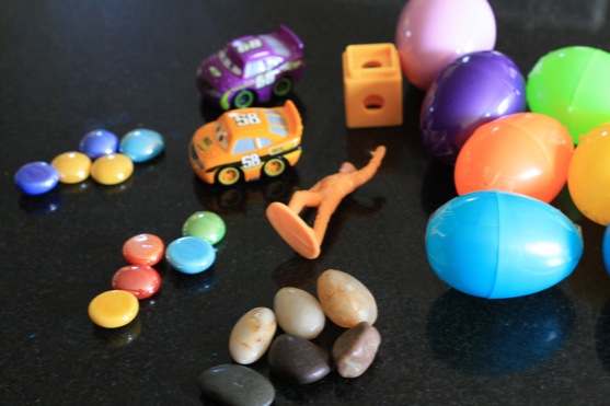 I created a “Sink or Float?” activity using plastic eggs and some random little things. (idea from No Time for Flashcards). Most of our eggs floated, but The Littlest Apple enjoyed playing with the eggs and the water, and opening the eggs to see what was inside. (And I should have put towels down, as I did for the dish-washing activity, because we got water everywhere!)
