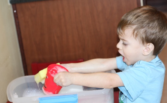 I gave The Littlest Apple a bucket full of soapy water, some dishes, a sponge, and a towel, and let him go to town washing dishes. I put towels on the floor to catch the water spills (and there were many!). He LOVED this! While he scrubbed the dishes, he sang “Keep it tidy, tidy, tidy. Keep it clean, clean clean.” This isn’t the best photo, but I liked it because you can tell he’s singing!
