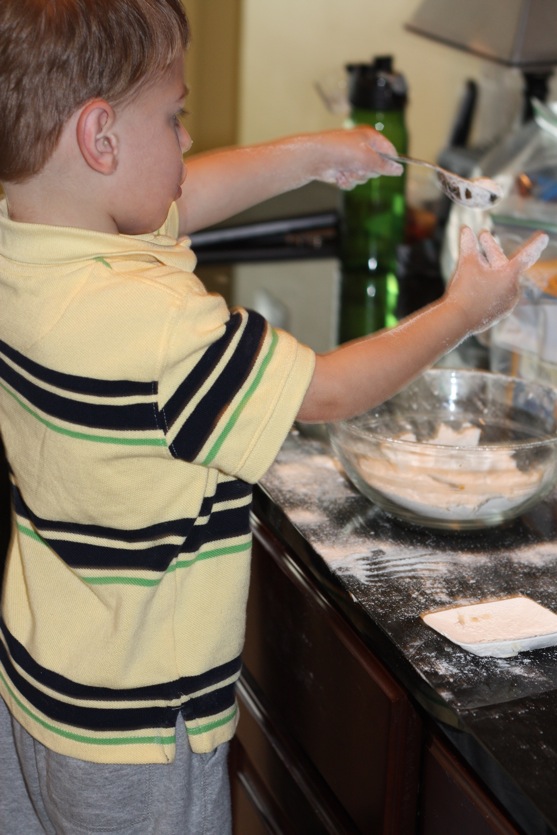 The Littlest Apple helped me bake banana bread. I really want to share my love of cooking and baking with The Littlest Apple, but he’s always a little over-eager and grabby when we’re cooking and baking together. This time, I tried a new technique I read about on Steady Mom. I gave The Littlest Apple his own bowl, and added ingredients to his bowl as I added them to my mixing bowl. This worked out great, because he could play to his heart’s content with his ingredients, I wasn’t worried about messing up my recipe, and nibble without contaminating my bread. It also gave him a bit of control too, in that he got to say “yes” or “no” to each ingredient. I was making banana bread, but he actually said “no” to bananas for his bread! It did get a little messy….