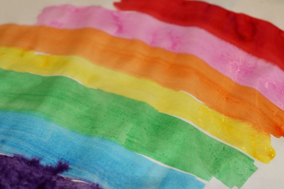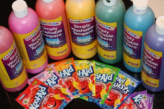 But I simply skimmed that layer off shortly before we started painting, and the vivid colors of the tempera paint and strong scent of the Kool-Aid remained in a water-color-like paint!