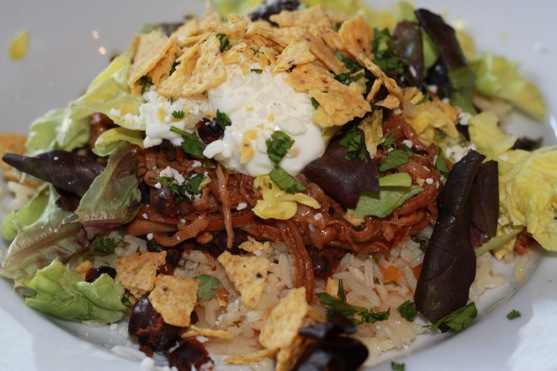 Assemble in aluminum deep-dish pans or simply use a plate. Lay a tortilla in the bottom of the pan, sprinkle Mexican blend cheese on it, and put in the oven at 375 for about 5 min or until the cheese is melted. Remove from oven, add beans, rice, pork, then lettuce and a little scoop of diced tomato and onions (pico de gallo). Add guacamole and sour cream. Add crushed tortilla chips, a shake of Cotija or Parmesan cheese, and top with a few cilantro leaves. Serve with the cilantro ranch or vinaigrette dressing and there you have it! (makes about 6 salads)