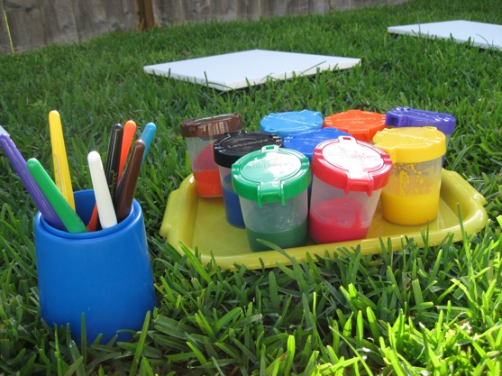 HOWEVER, we have absolutely NO shade in our backyard, and even at 9:30 in the morning, it was close to 90 degrees with no breeze. Fun for the kids painting and splashing in the pools, but not so fun for the mommies and little babies. We’ll be moving back inside next week. For future outdoor projects, we may meet in the afternoon (when our backyard is shaded and breezy), or move to a nearby park with a large covered pavillion.