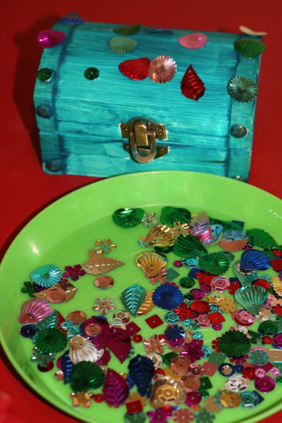 What child wouldn’t love a little treasure box of their own to store their most valuable toys, rocks, nature finds, and other special small items?  I found this little treasure box for $1.50 at Hobby Lobby.  The Littlest Apple and I painted it, then not-so-patiently waited to glue on some sequins.  He was offered sequins, buttons, and shells to adorn his treasure box, but he chose sequins.  He just “discovered” sequins last week, and absolutely LOVES them.  He spent more time playing with and inspecting the different sequins than he did on painting and gluing.  I happen to think that sequins reflect his sparkly little personality quite well.  This would make a great activity for a birthday party, playdate, or art playgroup!