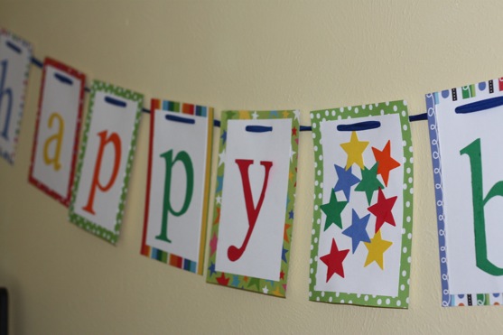 I love the bright colors of the paper I used! This is the best picture I have of the whole banner. We intended to trim the ribbon the left side but got distracted with other party prep.