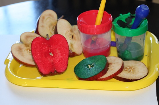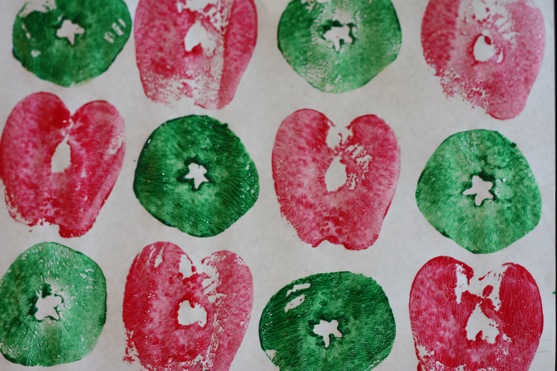 We tried printing with apples last year as part of our fruit and vegetable printing project for Art Playgroup, but this fall (last month actually…I’ve been slow posting this), I wanted to focus solely on apples. In particular, I wanted to try to get that elusive little star shape in the middle of apples that we didn’t see last year. The star shows up when you cut the apple horizontally, and we had the best luck with Red Delicious apples for this project.