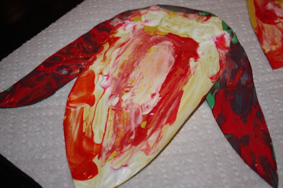 Pictured below, my fingerpainted version on the left, and one of our young artist’s cork stamped versions on the right.