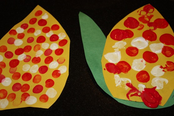 We painted our own Indian Corn at Art Playgroup this week, with this quick little craft (and by quick, I mean that most of the kids were done in less than 5 minutes!). This would be a great craft for a preschool Thanksgiving party! I pre-cut the yellow corn shapes and glued them to green leaves. Then I gave the kids small bowls of red, orange, and white paint. Most chose to stamp the paint with corks, but finger paint also works well for this craft. (Now that I’m thinking about it, q-tips would be excellent too and might keep the kids occupied a little longer.)