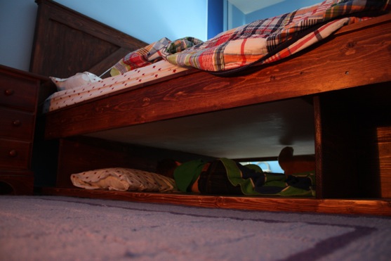 In our house, we are all about napping in creative locations. Sometimes we hang sheets from the (currently unused) top bunk to create a tent. Sometimes we put up the playtent. Sometimes we make nest and the baby bird hatches at the end of nap. Sometimes we even sleep under the bed too. And that’s how my 4-1/2 year old still takes naps about half the time.