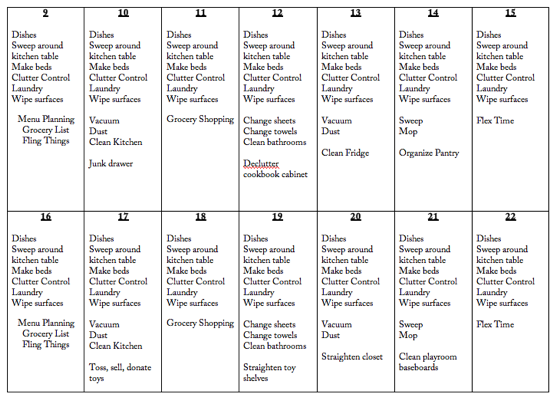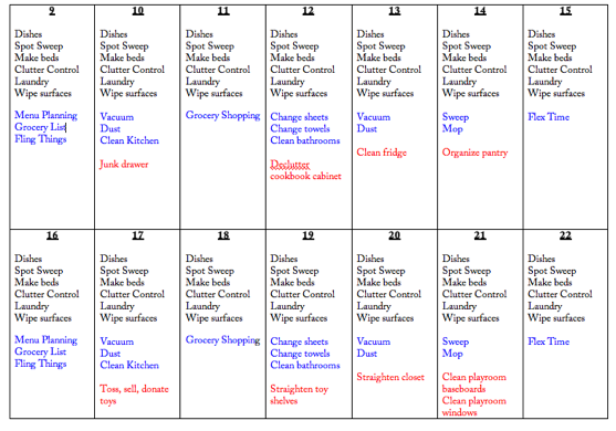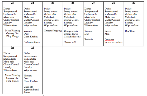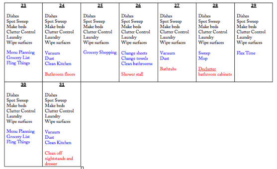 I love you! I was desperately trying to create my own calendar using Fly Lady concepts and I came across this!! I will use this. Thank you very much!!!!