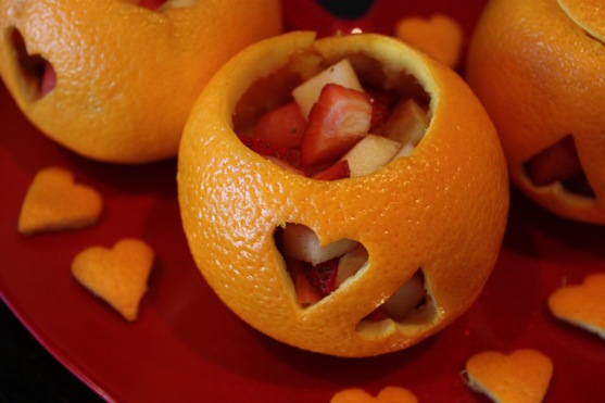 Similar in concept to the Jack-o-lantern Fruit Cups for Halloween, I simply cut a large hole in the top of each orange, hollowed them out (using my hands), then used some small heart cookie/candy cutters to punch out shapes on the side of the orange.  I found it easiest to start the cookie cutter on the inside and push out instead of the other way around.  (No, oranges aren’t particularly Valentines-y, but I thought doing this with apples-I needed 4- might be a little too tedious.)  I filled the orange cups with heart shaped watermelon slices, strawberries, and apple.