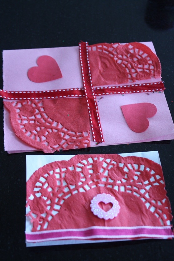 I was so excited to have some of our 3 year old friends over to make Valentines.  We had a table full of supplies: Red, pink, white paper, doilies, ribbon, glitter, heart cutouts, foam stickers, and paint.  The kids were way more interested in playing and snacking.  However, the mommies had a fun time putting together a few little Valentine’s while we visited.  Maybe there is something to be said for an afternoon of crafting just for us mommies?
