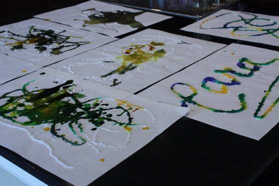 Now watch, as the watercolor runs across the salt and glue and stays off of the paper (unless you use too much paint…AHEM!). We found it fun to use several colors (in this case, yellow, green, and purple because we did this for Mardi Gras). It was neat to see the colors race to meet each other and mix together.