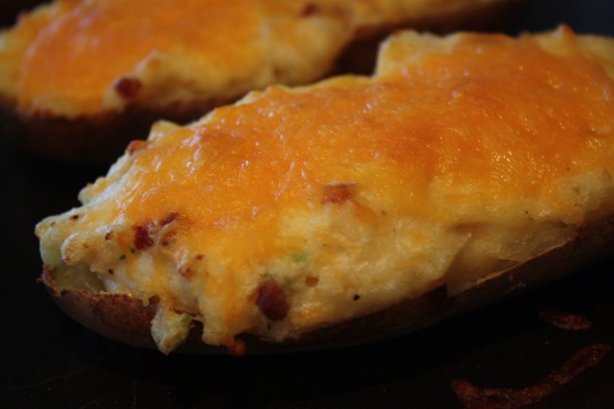 Holding each potato in a dish towel (they’re HOT!), slice each potato in half lengthwise. Then scoop the insides of each potato, adding to the mixing bowl. Be careful not to tear the shell.