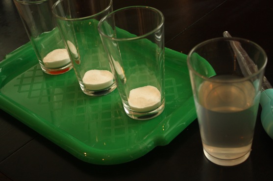 I put a small dollop of food coloring gel in the bottom of each glass, then put a couple tablespoons of baking soda in each glass, covering the food coloring completely. Then I filled up another glass with vinegar, and let The Littlest Apple use a turkey baster to transfer the vinegar to the cups of baking soda. This is what it looks like before he gets started….