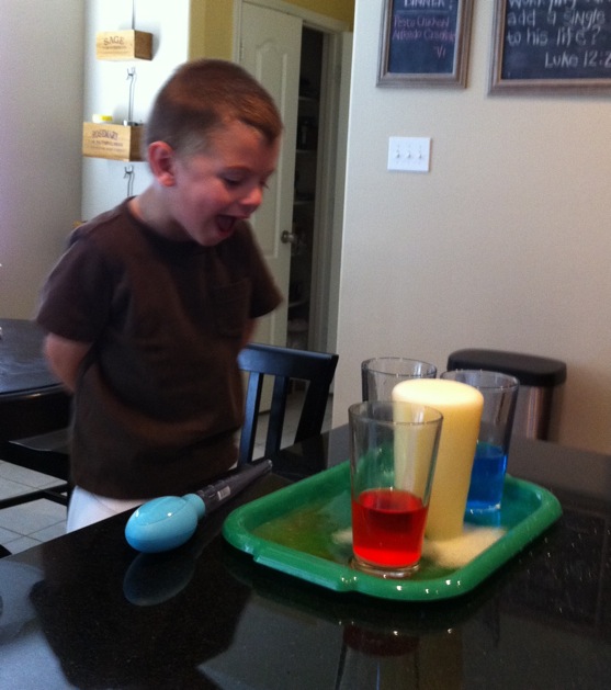 He LOVED the fizzy reaction, and the cool “surprise” colors that appeared in each cup as he added the vinegar to the baking soda with the turkey baster. This kept him busy for quite a while.