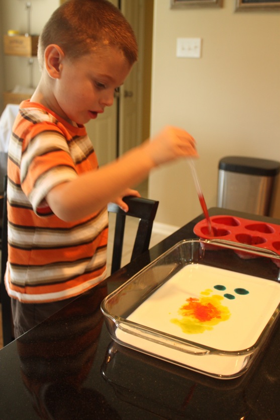 The Littlest Apple and I have re-visted the Fizzy Fun science experiment many, many times lately. He never gets tired of it, but I was ready to introduce some other quick and easy experiments. I’ve seen this cool milk magic experiment in many variations, but most recently on The Artful Parent and Our Best Bites.