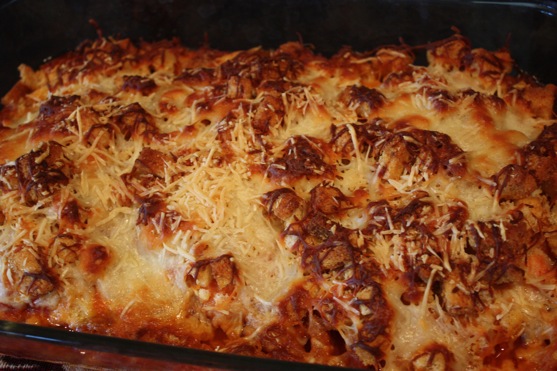 Chicken Parmesan.  One of my favorite Italian dishes, and something I’ve tried to recreate at home many times.  Making it can be labor intensive, since you have to fry the chicken first, then cover it with sauce.  This recipe for Chicken Parmesan Bake has been popping up all over Pinterest, so I gave it a try.  The neat thing about this recipe is that the chicken is baked, not fried and garlicky croutons are used for the “crust”.  I love the Food Wishes Video Recipes blog.  I think seeing a video of a recipe being made is especially useful for those of you who need to SEE each step of the recipe and not just read it.  This tasted great!  The top of the croutons get crunchy and crispy and the bottom of the croutons soak up the marinara, cheese, and chicken juice and taste amazing!  (This does taste best the day it is made…the croutons don’t hold up well for leftovers the next day.)