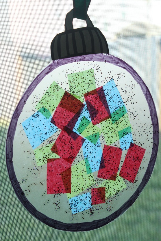 Trace a plate on the contact paper to get the basic circle shape for your ornament, then freehand the top of the ornament. Â (Make 2 of those, you’ll be sandwiching them together). Then peel the backing off one circle, and stick the tissue paper squares on. Â Add glitter if using. Â Then cut the aluminum foil to cover the top part of the ornament you free-handed, and stick that in place. Â Now take the backing off the other piece of contact paper, and carefully line them up, sandwiching the tissue paper and glitter inside. Â I then took a black sharpie and hand colored the outline on my ornament. Â (You could also use black construction paper as a border, as we did with the Easter version, but that’s a little more work!) Â Cut out a hole at the top for your ribbon, then hang your ornament in the window.