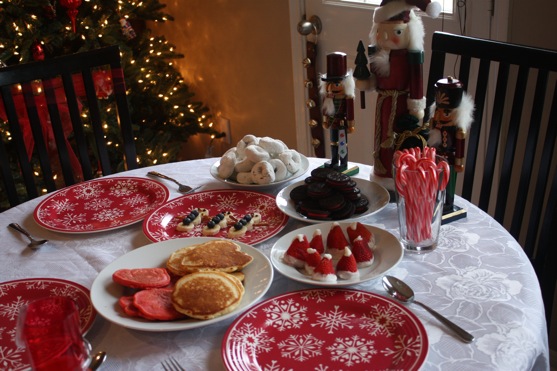 There were also some candy canes and Winter Oreos on the table just for kicks. Â It didn’t take very long to throw this all together. Â The most time consuming part was the pancakes, and you could prep the batter the night before.