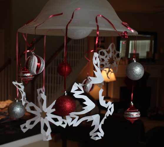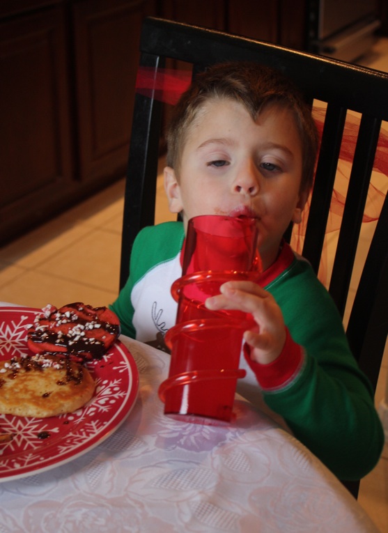 Before we even get to the menu, it was very important to me to make this a “special” breakfast with a tablecloth, decorations, and special cups and plates. Â However, the only NEW items I purchased were the red and white snowflake plates and the fun cup (from Target). Â I spent around $10. Â Since The Littlest Apple is very interested in Nutcrackers, I included the 3 we own on the table. Â I recruited my husband to cut out some snowflakes which I hung (okay, taped haphazardly) from the light fixture along with some red and silver ornaments.