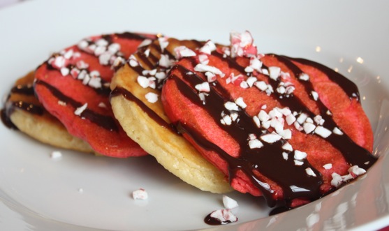 Serve alternating colors of pancakes topped with chocolate syrup, crushed peppermint candy, and whipped cream.
