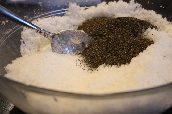 Combine the sea salt and Epsom salt in your mixing bowl. When the two salts are completely blended, add olive oil, peppermint extract and lemon extract. Stir each time you add an ingredient, making sure to break apart any large chunks of salt with your spoon. Once these liquid ingredients have been fully incorporated, your salt mixture will look like moist sand (and it will smell pretty good too!). Now it’s time to add the cornstarch and baking soda. Again, blend thoroughly, breaking apart any large clumps of baking soda or salt.  Almost done! Now add the final ingredient – the peppermint leaves. (I add this last, because I’ve found that adding them early in the process causes the leaves to bruise and give off their green color to the salt.) Stir the leaves in until they are fully blended with the salt mixture. Go ahead and take a deep breath while you’re at it – it should have a very refreshing scent!