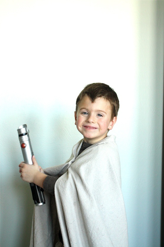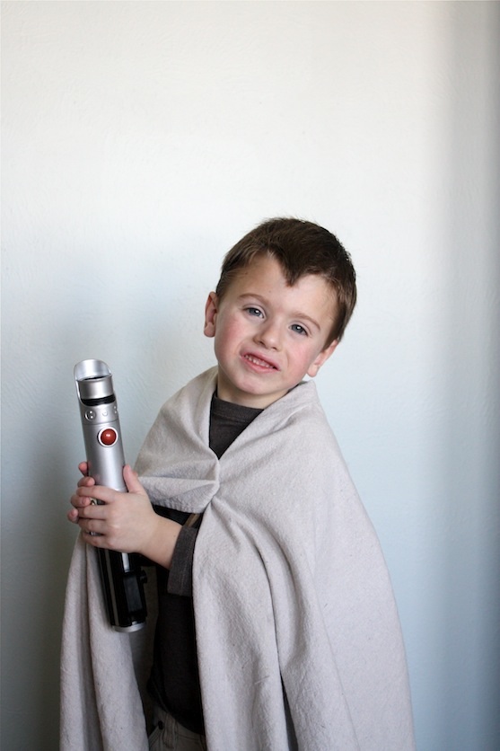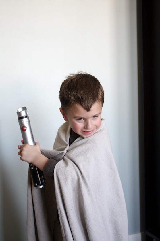 The Little Apple is wearing a too-small brown shirt backwards so the logo is hidden. Â And The Picky Apple was genius enough to fashion a “robe” out of our Drop Cloth Curtains. Â I’m so glad he was in charge of the photo-taking, because I never would have thought to do that! Â Conveniently, The Little Apple has a toy light saber, so that was the easy part!