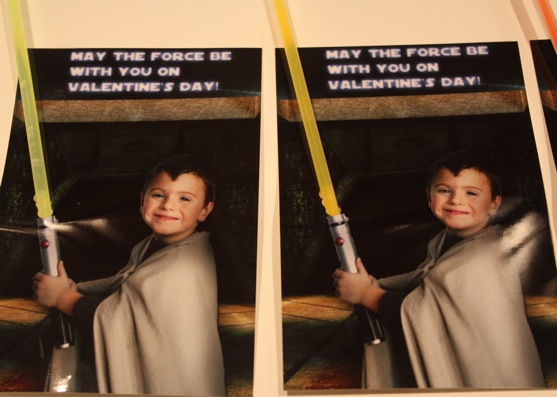 Star Wars Valentines for my little Star Wars enthusiast! Â I pinned several Valentine ideas on Pinterest that were variations on the glow-sticks-as-light-sabers theme. Â So after I found the perfect glow sticks in the dollar bins at Target, I decided to make a go of it. Â And to give credit where credit is due, at this point in the process, I showed The Picky Apple the pictures on Pinterest and said “Do this. Â Make it happen.” Â And then he worked his magic.