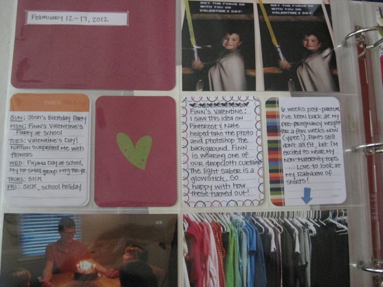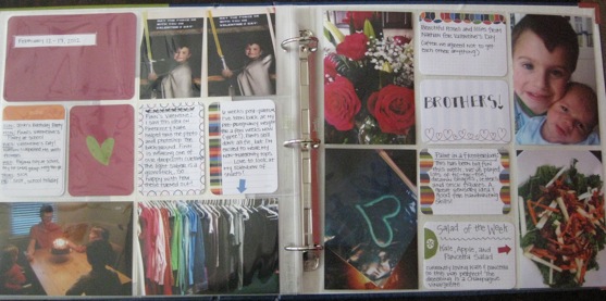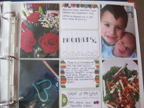 But for now, I’m jumping in. Â I’m doing a page for each week. Â Since I’m still learning about the process, I’m keeping it super simple right now. Â Pictures (many of which were taken from an iPhone) and notes on the journaling cards popped in to the plastic protectors. Â Every once in a while I’ll throw in a receipt, keepsake paper, or other bit of ephemera. Â Maybe a few stickers. Â No real embellishing or fancy papers or fancy cuts.