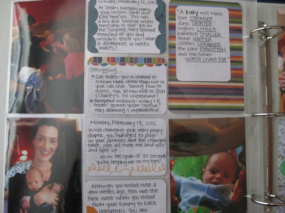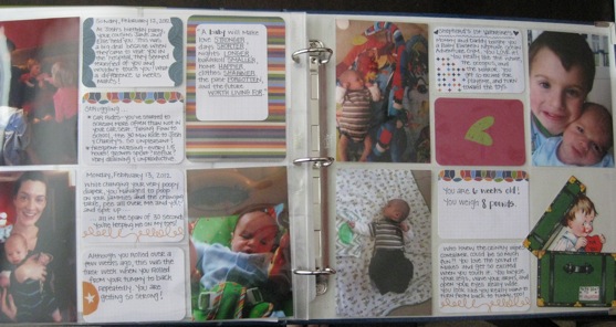 And here is a page from Slingshot’s second weeks. Â Even though he’s only 7 weeks old (today!), I’m already finding myself forgetting the little things from those first few weeks of his life. Â And I don’t want to forget! Â It’s so nice to be able to look back at these pages and remember it all. Â THIS is exactly why I’m doing Project Life.